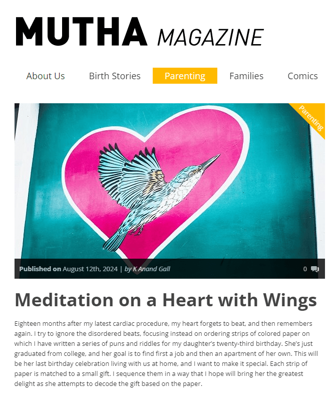 K Anand Gall (they/them) is a multi-genre writer who writes about the body, adoption, motherhood, and spirituality. Their poetry, fiction, and creative nonfiction have appeared in dozens of publications. They were the 2023 Academy of American Poets Betty Jane Abrahams Memorial Poetry Prize winner, a 2022 finalist in The Arkansas International C.D. Wright Emerging Poet’s Prize, and finalist in the 2022 Midwest Writing Center’s Foster-Stahl Chapbook Series. K holds a BA in Sociology and Anthropology from Nebraska Wesleyan University, an MA in Creative Writing from San Francisco State University, and an MFA in Creative Writing from Miami University.